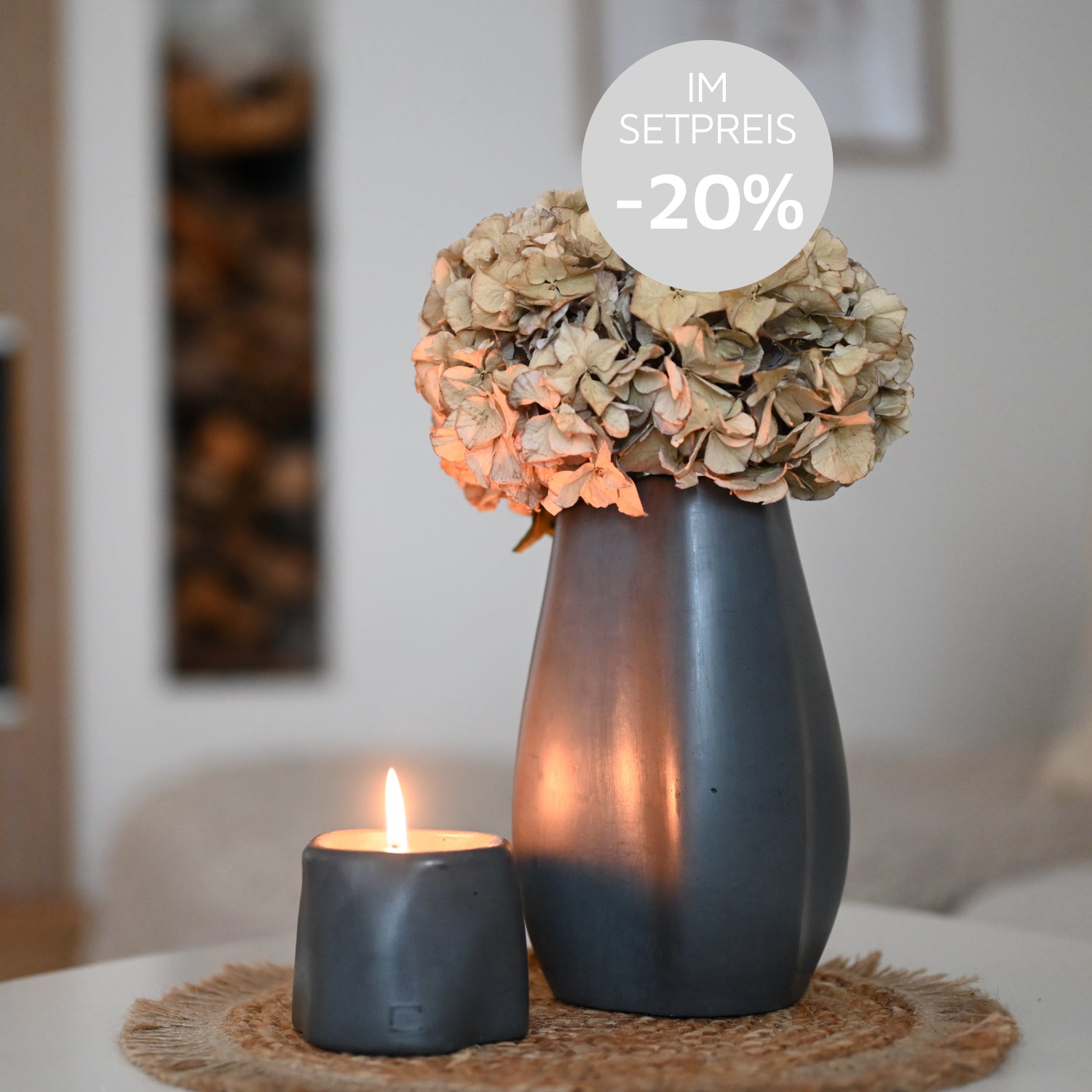 Das Design-Set besteht aus einer Indoor-Kerze mit Wachsgranulat und unserer Vase. Diese beiden Formen zeichnen sich durch ihre gequetsche Form aus, und passen somit perfekt zueinander.